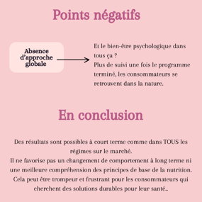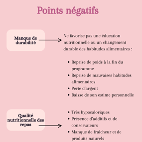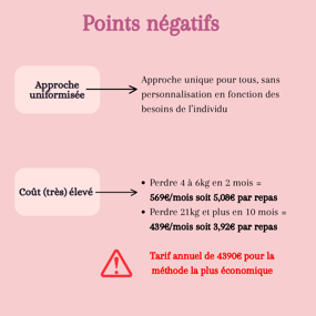 Cependant, derrière cette popularité se cachent des points négatifs souvent négligés. Bien que le programme propose des plats préparés et une approche simple, certains critiques soulignent le manque de variété, ce qui peut rendre l'expérience monotone à long terme.