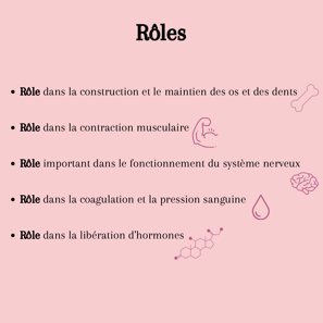 Ses rôles sont multiples : il contribue à la formation et à la solidité des os et des dents, joue un rôle clé dans la coagulation sanguine, et participe à la transmission nerveuse et à la contraction musculaire.