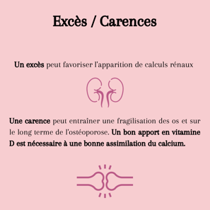Cependant, un excès de calcium peut entraîner des problèmes de santé, tels que des calculs rénaux ou des troubles cardiaques, tandis qu'une carence peut provoquer l’ostéoporose, des crampes musculaires et des anomalies dentaires.