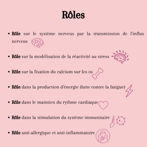Ce minéral est impliqué dans la synthèse des protéines, la régulation de la fonction musculaire et nerveuse, ainsi que dans la production d'énergie.